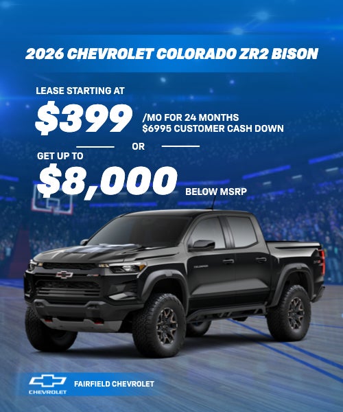 DISCLAIMER = Lease based on 2026 Chevrolet COLORADO ZR2 BISON (STOCK # 260089). MSRP of $65820 - $7394 CUSTOMER CASH DUE at lease signing including $399 first monthly payment, $0 acquisition fee, plus taxes, titles, license and documentary service fees. No security deposit requiredfor TIER 1 customers. Monthly payment Includes $2000 CHEVY CONQUEST PROG (must have a 2012 OR NEWER Ford Ranger, Honda Ridgeline, Jeep Gladiator, Nissan Frontier, Toyota Tacoma, Ford Bronco, Jeep Wrangler in the household, if not $2000 must be put down to match the offered monthly) . Rebate $1250 GM WEARHOUSE EXECUTIVE member discount,Rebate $500 GM REWARDS CARD SIGN UP, REBATE $500 GM LEASE LOYALTY(MUST HAVE A CURRENT GM OR NON-GM LEASE IN THE HOUSEHOLD) Lessee is responsible for $.25 per mile over 10,000 miles year, excess wear, and a $395 termination fee. Offer Expires 04/30/2026. OR DISCLAIMER = Applies to 2025 Chevrolet Colorado ZR2 BISON (STOCK # 260089). in stock. Dealer Discount $3750. Rebate $500 GM REWARDS CARD SIGN UP (conditions apply) $500 chevrolet bonus cash, $1250 GM wearhouse executive member discount, $2000 CHEVY CONQUEST PROG (must have a 2012 OR NEWER Ford Ranger, Honda Ridgeline, Jeep Gladiator, Nissan Frontier, Toyota Tacoma, Ford Bronco, Jeep Wrangler in the household, if not $2000 must be put down to match the offered monthly) total rebates - $4250. Prices do not include government fees and taxes, any finance charge, any dealer document processing charge, any electronic filing charge and any emissions testing charge. . Offer Expires 04/30/2026.OFFER CAN NOT BE COMBINED WITH SPECIAL APR